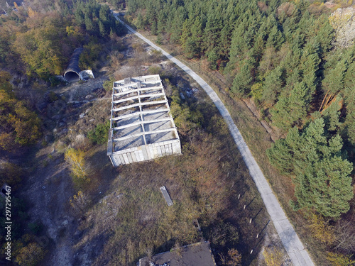 © Sergey Kamshylin, Fototapeta premium Drone quadrocopter explores an abandoned totally marauded and vandalised Soviet military base. Near Chernobyl Area.