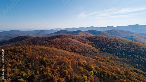 © TheseusStock, Naklejka premium Drone shot of a scenic mountain range with fall colors.