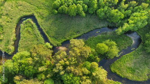 © Piotr Krzeslak, Naklejka premium Drone shot of natual river during summer with canoeing peoples
