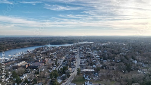 © Wirestock, Obraz premium Drone shot of roads and houses near a river in Rhode Island, USA