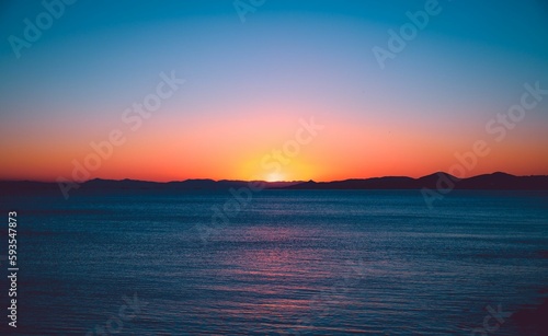 © George Moniodis/Wirestock Creators, Naklejka premium Drone shot of scenic sunset over the calm sea in the evening, cool for the background