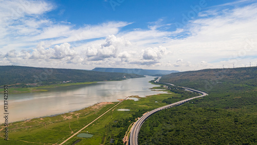 © Kaikoro, Obraz premium Drone shot The M6 motorway Nakhon Ratchasima Province - Bang Pa-in Lam Ta Khong River and Mountain. Motorway Korat Thailand