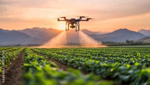 © malayeka, Fototapeta premium Drone spraying crops at sunset over farmland.
