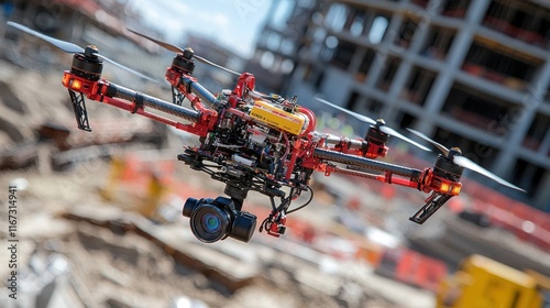 © arsyi_06, Obraz premium Drone surveying construction site with building backdrop.