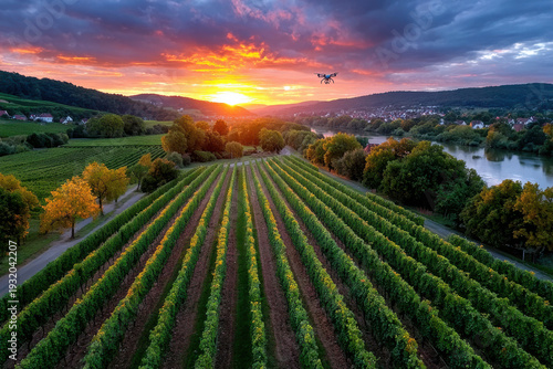 © YouraPechkin, Fototapeta premium Drone Surveying Vineyards at Sunset over River