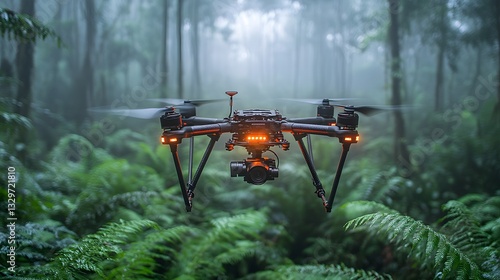 © Warakorn, Naklejka premium Drone technology collecting carbon sequestration data over dense tropical forests with advanced sensors