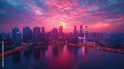 © Waraporn, Fototapeta premium Drone Timelapse of a Vibrant City Skyline at Sunset Showing the Buildings Lights Flickering On as the Sky Transitions from Orange and Pink to Deep Purple and Blue Hues