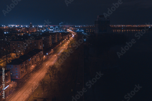 © Denis Chubchenko, Fototapeta premium Drone view at night, with illuminated streets and dark sky. Beautiful cityscape