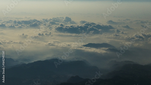 © Bernabe, Fototapeta premium Drone view of a breathtaking mountain landscape above the clouds, showcasing rugged peaks and serene valleys in a stunning high-altitude natural scene.