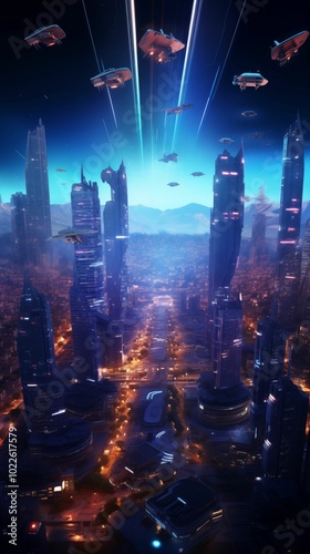 © Pro SVG Files, Fototapeta premium Drone view of a city at night in games style background for mobile, 9:16 ratio. Generative ai