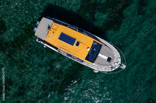 © tamergunal, Fototapeta premium drone view of a luxury motor yacht in a beautiful clear sea.