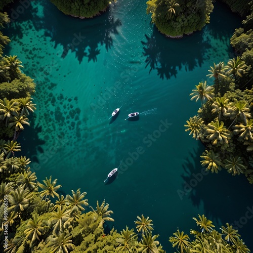 © Ahmedzaki, Fototapeta premium Drone view of a tropical lagoon surrounded by dense rainforest, where the turquoise waters shimmer in the sunlight and boats drift lazily across the surface