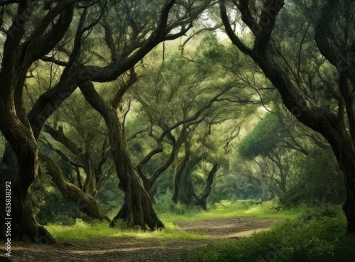 © lililia, Naklejka premium Drone view of amazing green forest with trees and bushes growing in countryside. Created with Generative AI technology.