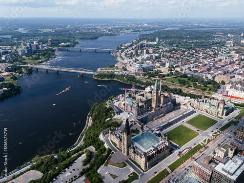 © Artem Onoprienko, Fototapeta premium Drone view of Canadian Parliament, Parliament Hill, House of Commons, and East Block in downtown of Ottawa and river in a sunny day, Canada.