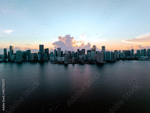 © Jason, Fototapeta premium Drone view of downtown Miami skyline at sunset from over Biscayne Bay
