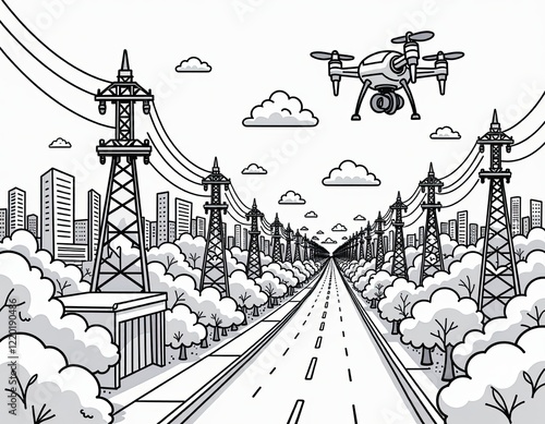Obraz premium Drone View of Highway, Power Lines, and Cityscape - Black and White Line Art Illustration