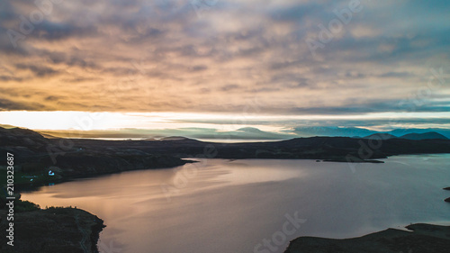 © Scenessence, Fototapeta premium drone view of lake during sunset in iceland