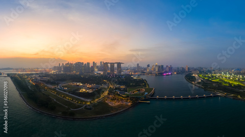 Fototapeta premium Drone view of Singapore Gardens by the Bay botanical gardens and Marina bay sands at twilight