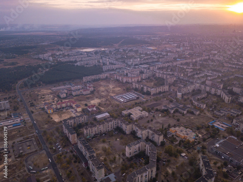 © Antonio, Fototapeta premium Drone view of smoke floats over the small town in Ukraine