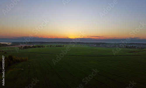 © Payllik, Fototapeta premium Drone view of the evening landscape at sunset with fields and clouds
