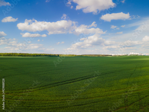 © Tatiana, Obraz premium Drone view of the forest and fields, top view and blue sky on a sunny summer day