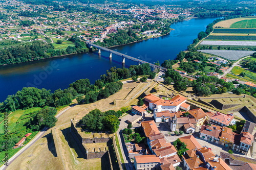 © VicVaz, Fototapeta premium drone view of the Minho river border between Spain and Portugal, cities of Valença do Minho and Tui on each bank.
