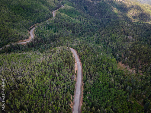 © Eifel Kreutz, Obraz premium Drone View of Winding Mountain Road in Sangre De Cristo Mountains near Santa Fe, New Mexico