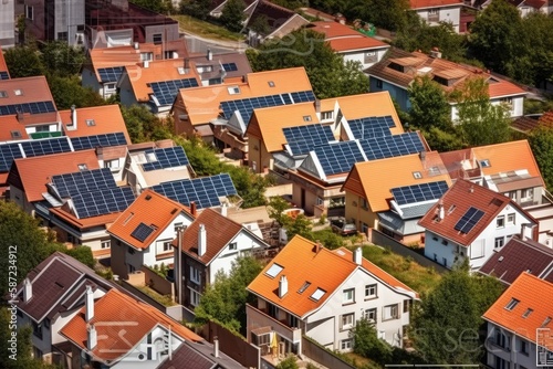 Obraz premium Drone view on suburb houses with solar panels on the rooftop