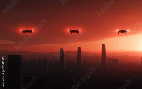Fototapeta premium Drones flying at sunset over urban skyline aerial photography cityscape dramatic atmosphere