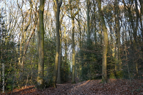 Fototapeta premium Dronfield, North East Derbyshire, England – December 3 2023: Scenic winter woodland path with leaf littered trees in light afternoon sunlight.