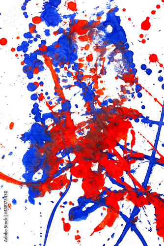 Fototapeta premium Drops of red and blue paint on a white background.