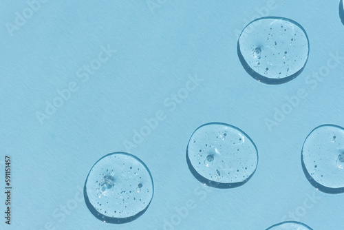 © Marina Kaiser, Naklejka premium Drops of serum or hyaluronic acid gel with bubbles on a blue background. Smears of cosmetic skin care products. Wellness and beauty concept