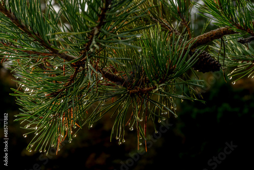Fototapeta premium Drops on pine needles on a rainy fall afternoon