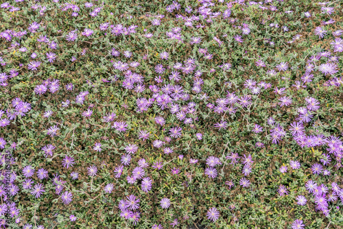 © youli zhao, Naklejka premium Drosanthemum floribundum, rodondo creeper, pale dewplant, or dew-flower, is a succulent plant in the ice plant family, Aizoaceae. Lovers Point Park, Monterey bay, California