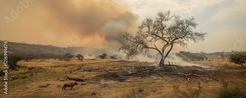© Nookie DreamWorks, Obraz premium drought disaster mitigation concept. A lone tree stands in a dry, smoky landscape affected by wildfires.
