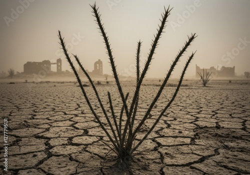 Fototapeta premium Drought-stricken landscape featuring a solitary madagascar ocotillo amidst cracked earth and abandoned structures
