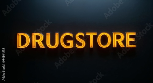 © Erlinda, Obraz premium Drugstore word lettering with yellow glow on plain black dark background
