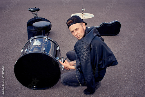 © LIGHTFIELD STUDIOS, Fototapeta premium Drummer in black clothing pointing at drum kit on street