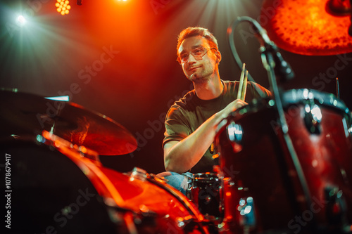 Fototapeta premium Drummer playing drums on stage with warm lighting