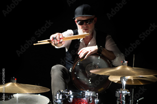 Fototapeta premium Drummer with a drumsticks in his hands sits behind drum kit on the black...