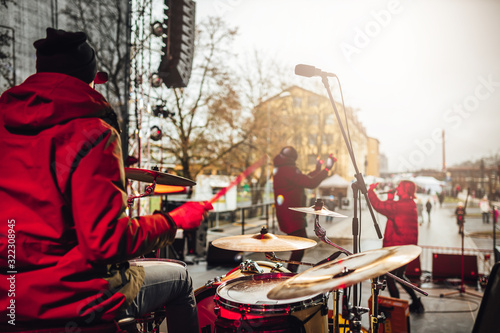 Fototapeta premium Drumset in close up view on stage, drummer playing set on stage