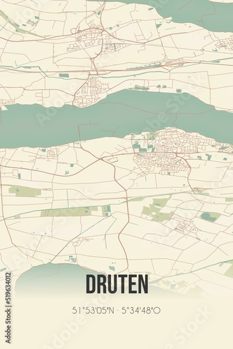 Obraz premium Druten, Gelderland, Rivierenland region vintage street map. Retro Dutch city plan.