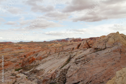 Fototapeta premium Dry arid landscape of red and yellow layers of sandstone, fossilized ancient sand dunes in the American southwest desert states