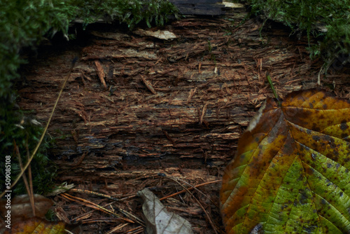 © Mk16.15, Obraz premium Dry autumn oak leaf on wet bark of a tree background with green moss and foliage after rain