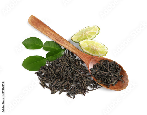 Fototapeta premium Dry bergamot tea leaves, wooden spoon and fresh fruit on white background,...