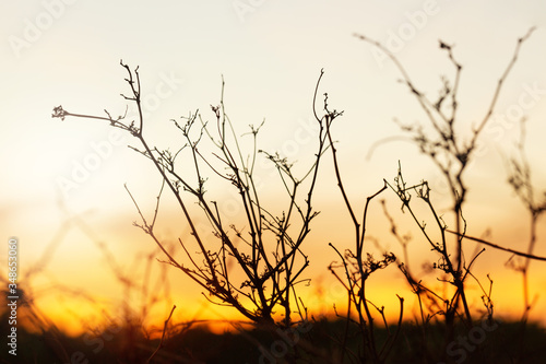 Obraz premium Dry branches with wildfire burning as background.Twilight scene.