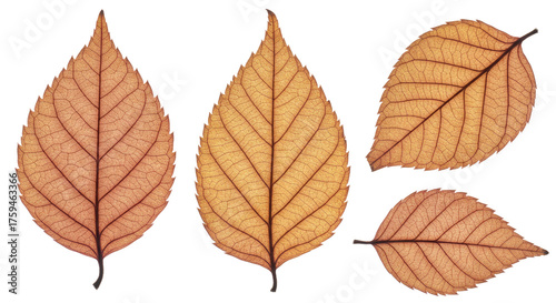 © Mustika, Fototapeta premium Dry brown autumn leaves isolated on white background with detailed veins for seasonal decoration and nature projects