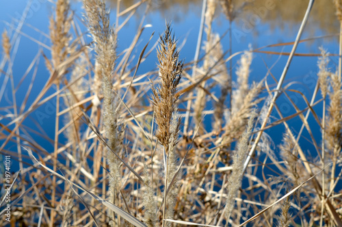 Fototapeta premium Dry bulrush around the lake. Autumn.