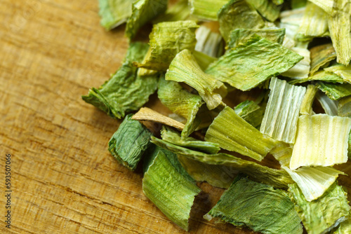 Fototapeta premium Dry chopped spring onion leek. Chopped dried green onion or scallion. Spices and herbs.