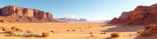 © Katherina, Fototapeta premium Dry desert landscape with rocky outcrops and sandy dunes , terrain, landscape